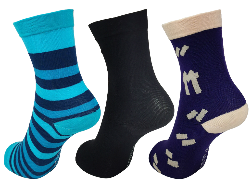 3 pairs of bamboo socks: Blue Stripes, Plain Black and Purple Logo Dash socks.